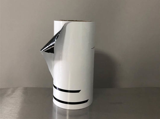| • Logo d'impression de boîte, nom de la société dans différentes couleurs sur la surface en aluminium adhésive de feuille de film protecteur. |